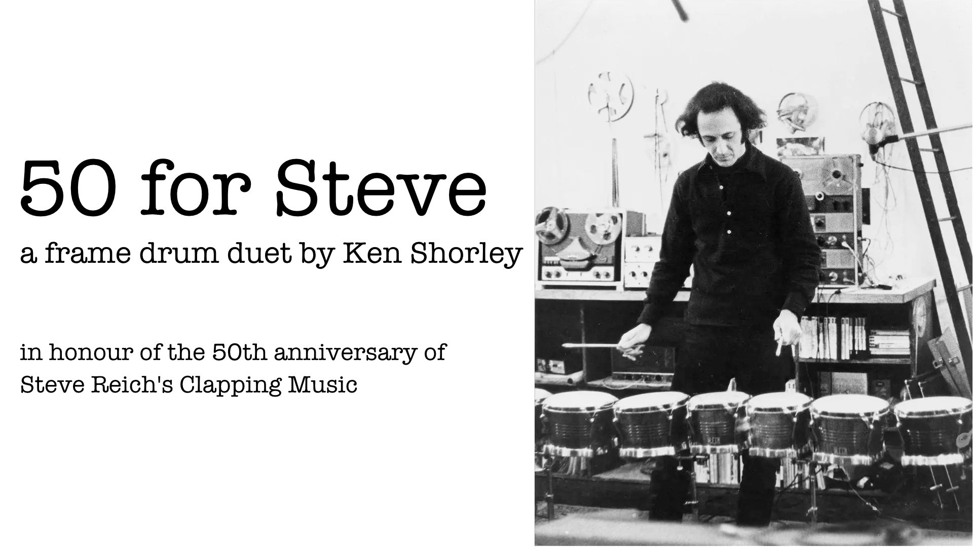 A frame drum duet inspired by the 50th anniversary of Steve Reich's seminal piece, Clapping Music. Can be performed by two drummers, or by a single performer with a loop pedal.